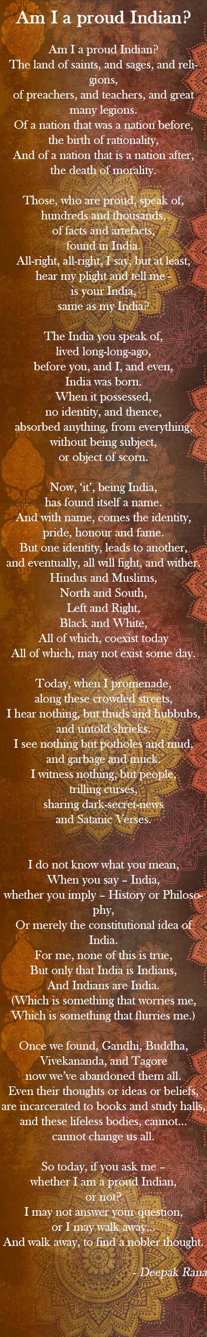 Am I a proud Indian? Posted byDeepak RanaAugust 4, 2015April 6, 2020Posted inNotes, Poems and lyrics Like Loading... Published by Deepak Rana A writer, a wanderer. Keeps dreaming and aspires to make them true. View more posts